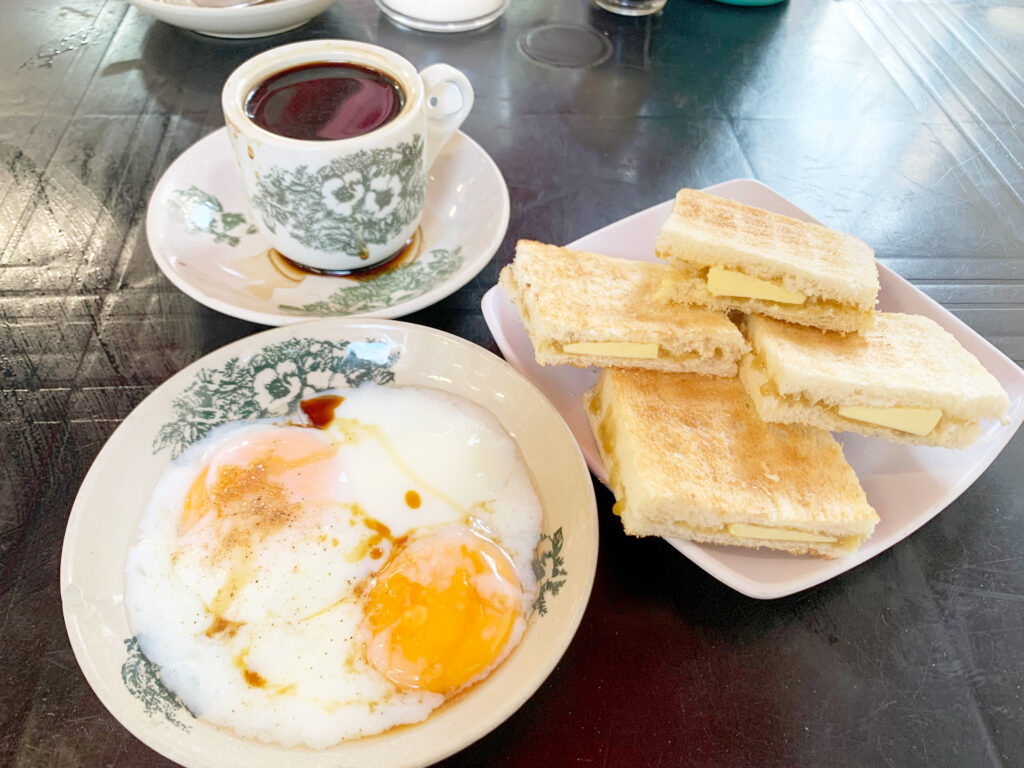宿からテクテク歩いて向かった朝ごはんは、冷たいバターを挟んだカヤトーストのセット。朝っぱらからバターの塊を食べるの?と恐る恐る口にしたら……すごく美味しい。甘いコーヒーにとても合います。