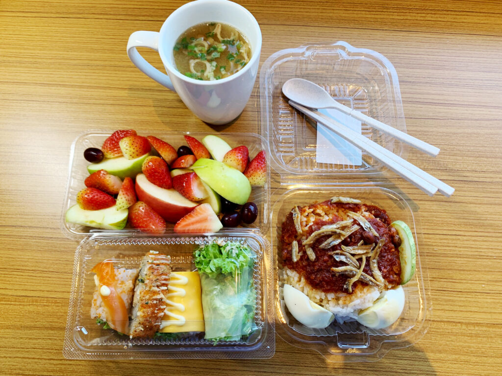 左下から寿司・ナシレマ・フルーツ合わせて24.1MYR、800円くらい。お寿司は変わり種しかないので、選ぶのけっこう迷います。全体的に派手で可愛いお寿司ばかりでした。